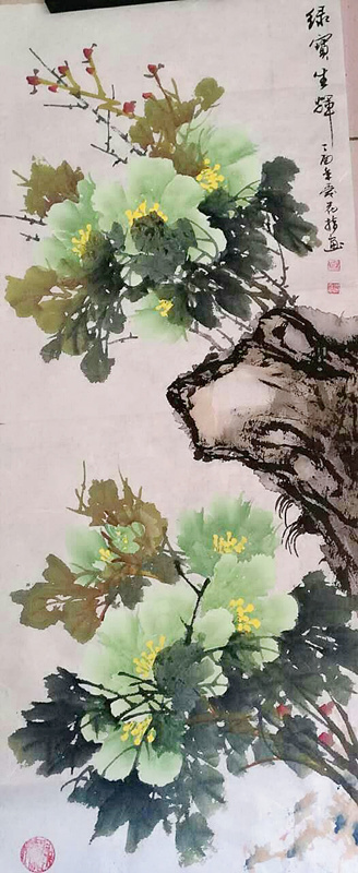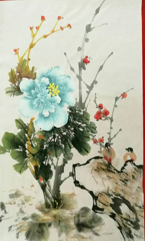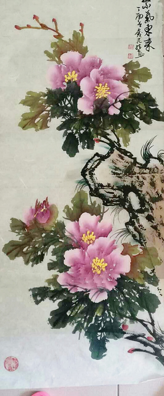 "乔爱花"画牡丹,也是希望人世间像牡丹花那样充满生机,充满美丽,象牡丹花那样激情绽放绚丽的色彩,带给人们美好的未来。